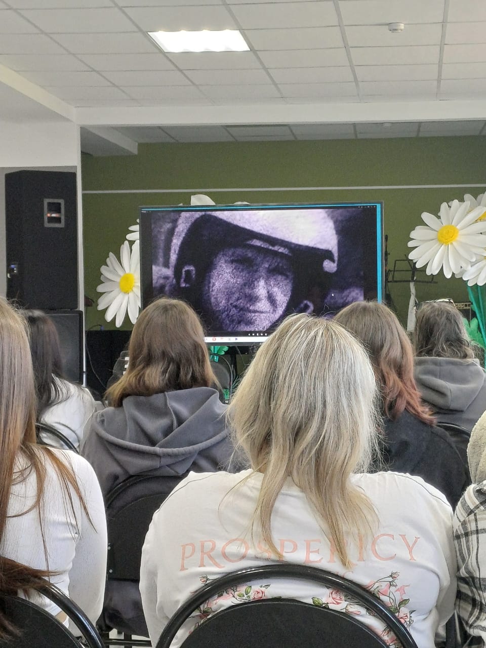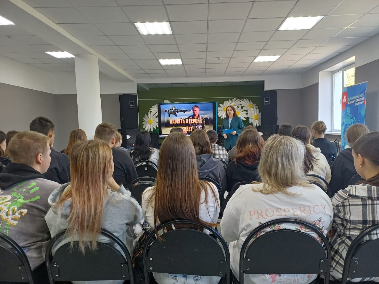 На встрече студенты третьих курмов посмотрели документальный фильм, который рассказывал не только о подвиге лётчика Романа Филипова в Сирии, но и о его личности.