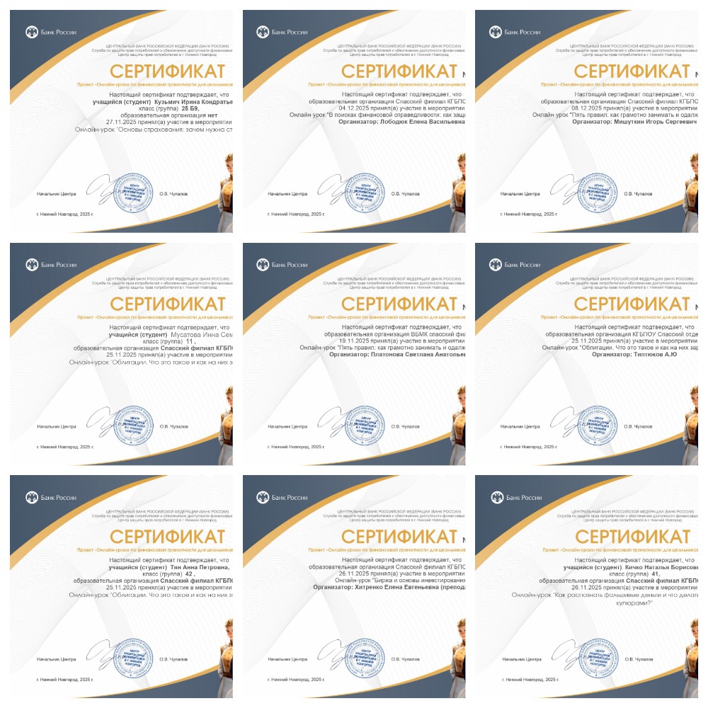Студенты и преподаватели Спасского филиала КГБПОУ «ВБМК» приняли активное участие во всех темах базового и продвинутого уровня, посвященных непосредственно студентам СПО, о чем свидетельствуют сертификаты, полученные по результатам участия в проекте.